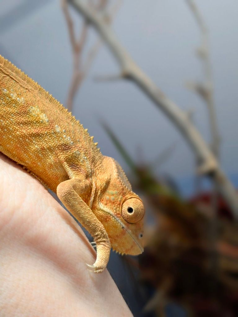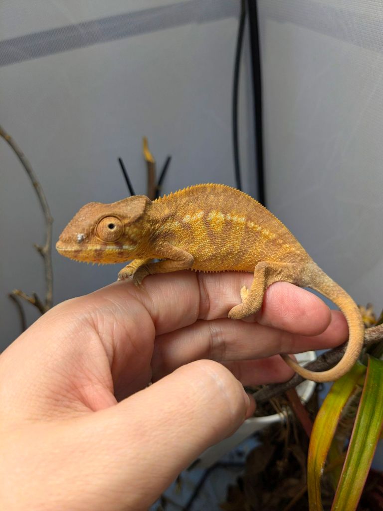 Cheddar is a 2025 Ambilobe baby panther chameleon currently available here at Phoenix Chameleons. She got her name from that beautiful cheesy orange! This girl is sweet and bold – she is always sitting front and center in her enclosure and is happy to sit on my hand.