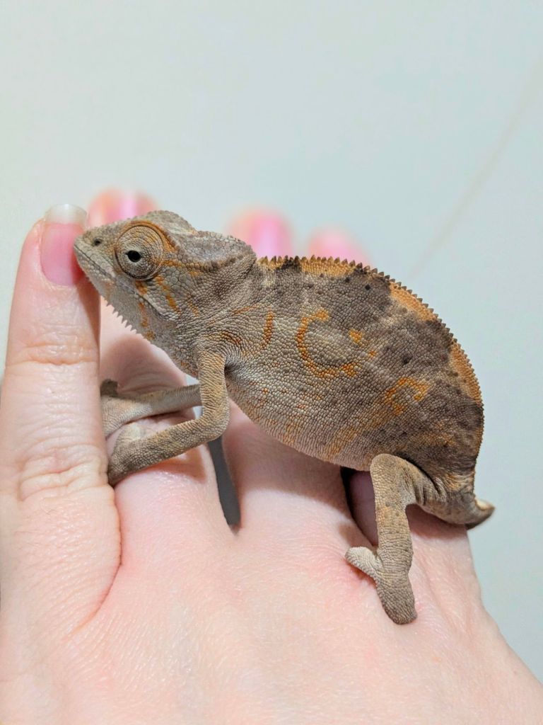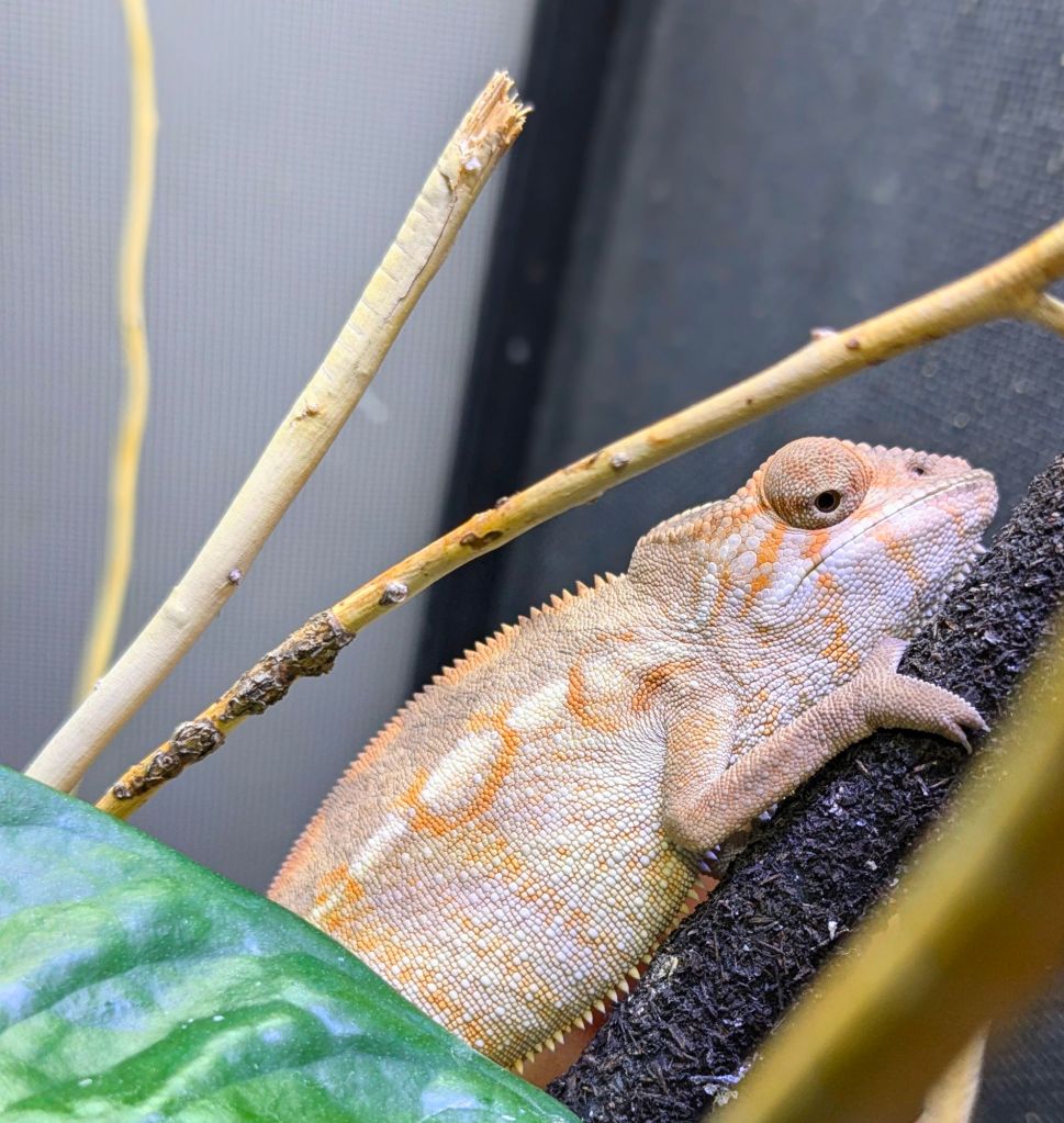 Creamsicle is a 2025 Ambilobe baby panther chameleon currently available here at Phoenix Chameleons. She got her name because of her beautiful bold orange rings on her cream body color. This is another girl from this clutch with a super sweet personality. This gal is our favorite of the year!